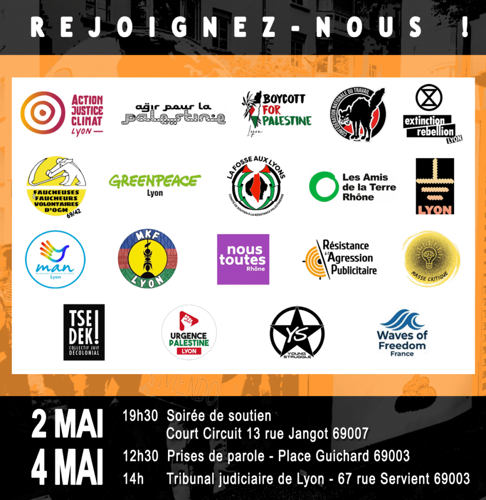 La police et l’État se mettent au service des publicitaires et du régime génocidaire israélien et de ses soutiens en réprimant ces actions de sensibilisation des militant•es. Cette répression disproportionnée pour une action non violente et non dégradante est une entrave à la liberté d’expression. De plus, ceci arrive à l’aube d’une proposition de loi souhaitant faire de la critique d’Israël un délit. Nous assistons désormais à une véritable criminalisation des mouvements critiques, à l’heure de l’urgence humanitaire, sociale et écologique. Malgré la multiplication exponentielle des procès à l’encontre des militant•es, n’ayons pas peur des procédures-baillons et restons solidaires ! Il est urgent de ne pas baisser les yeux face à ces intimidations.